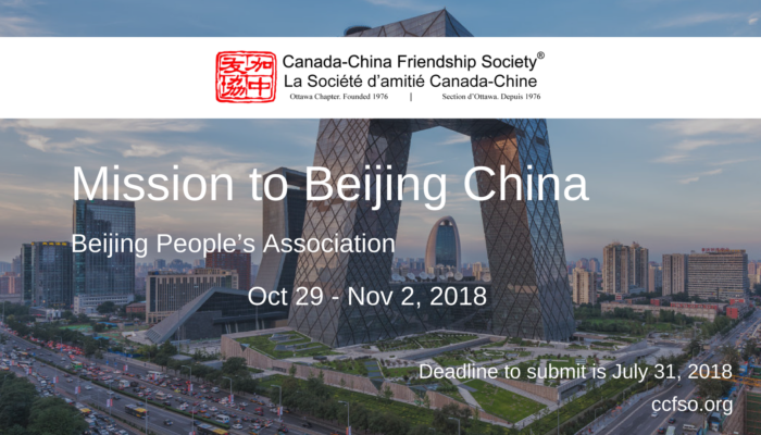 The Beijing People’s Association for Friendship with Foreign Countries (hereinafter, the “Beijing Friendship Association”) has invited CCFS Ottawa to send five to six Canadian delegates with expertise in the field of medicine to join a mission to China. Delegates may come from the academia, or may be hospital directors/managers, medical professionals or other professionals linked to the field of medicine.